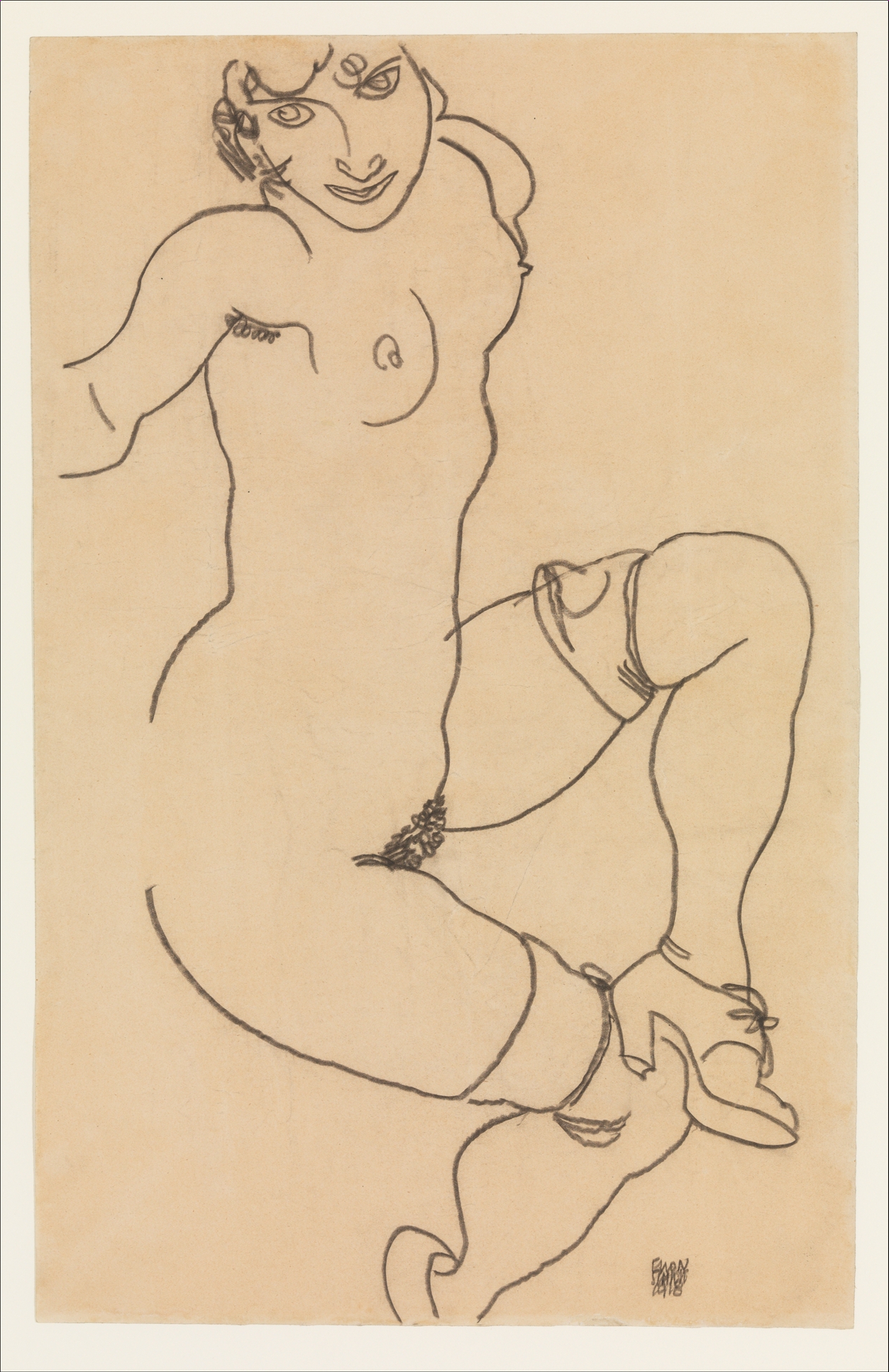 Expressionist contour line drawing of a seated nude woman in the style of Egon Schiele