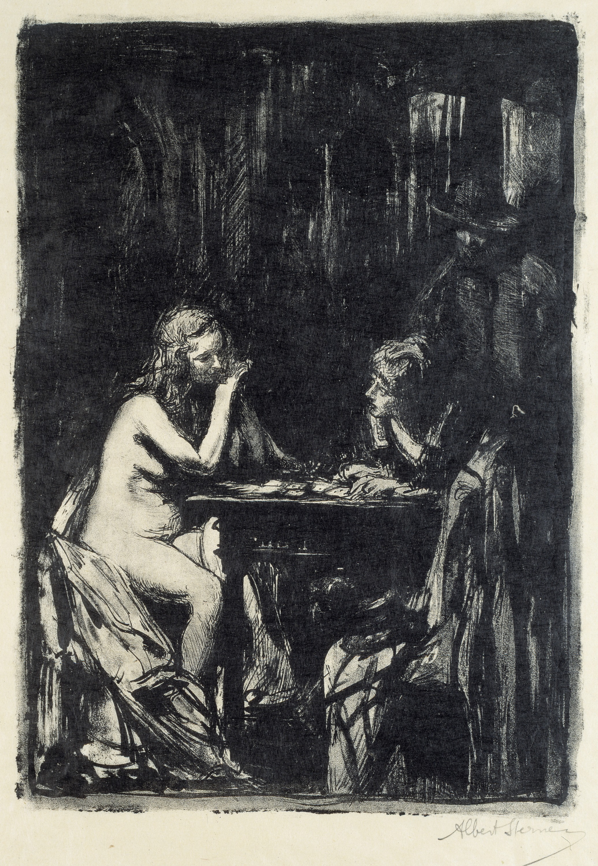 Dark lithograph of a semi-nude woman seated at a table across from a shadowy figure in deep chiaroscuro