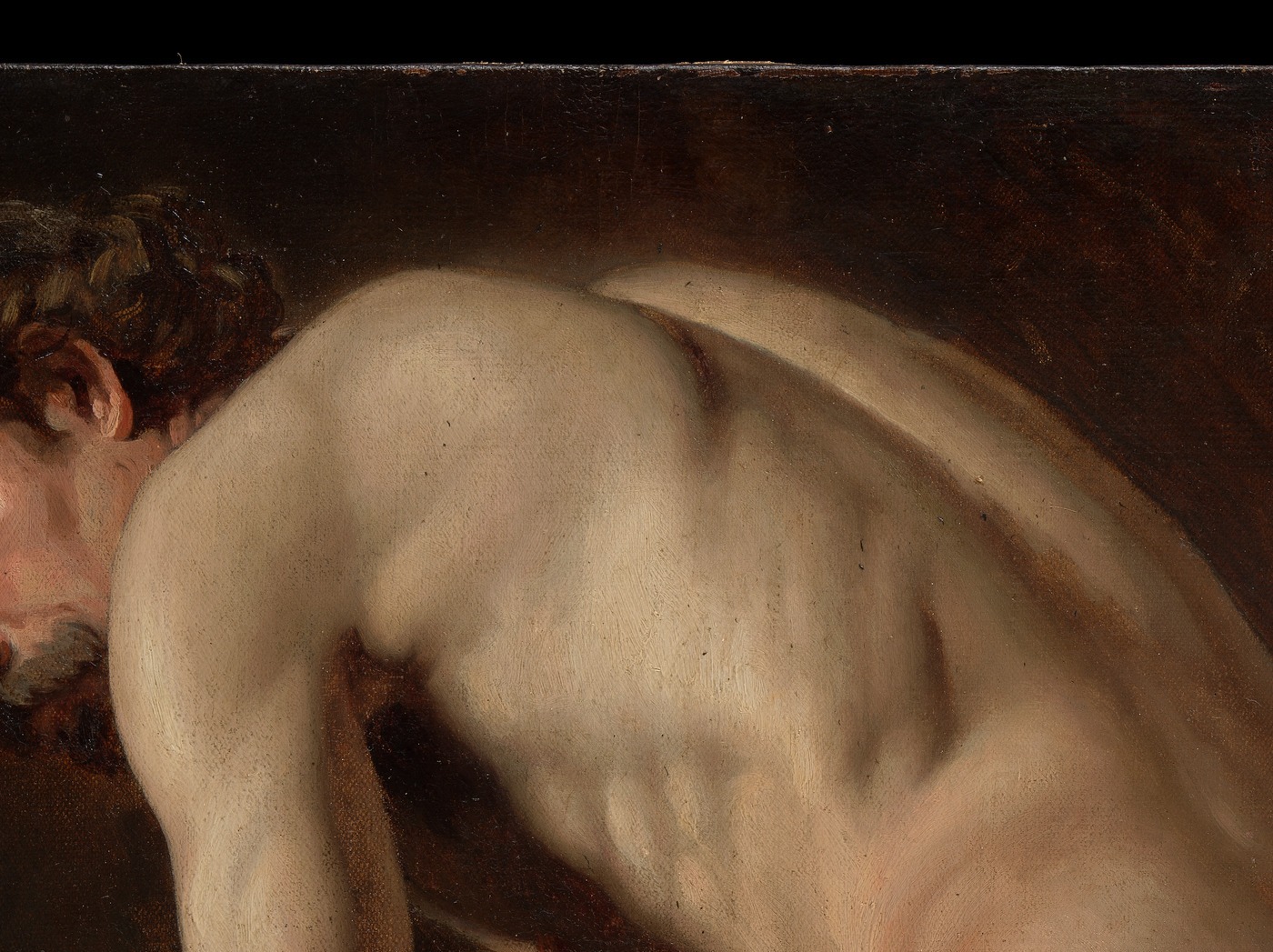 The downward curl of the head, dark tousled hair falling against the pale vulnerable nape — the face averted, denied to us, makes this region intensely private. The surrender in the bowed neck carries the emotional weight of the entire composition.