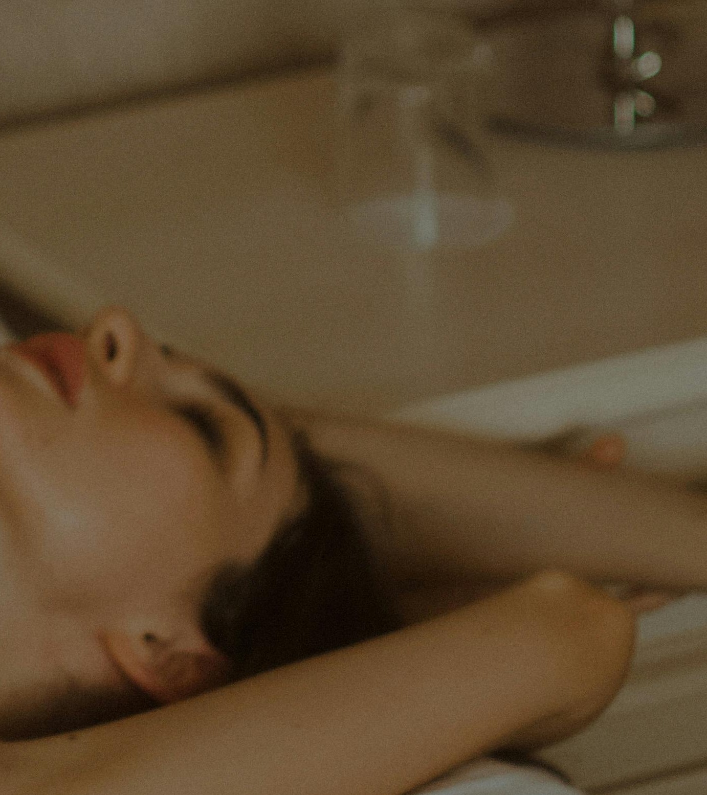 The exposed inner wrist and outstretched arm reaching past the headboard — vulnerability made gesture, the body opening itself to empty space