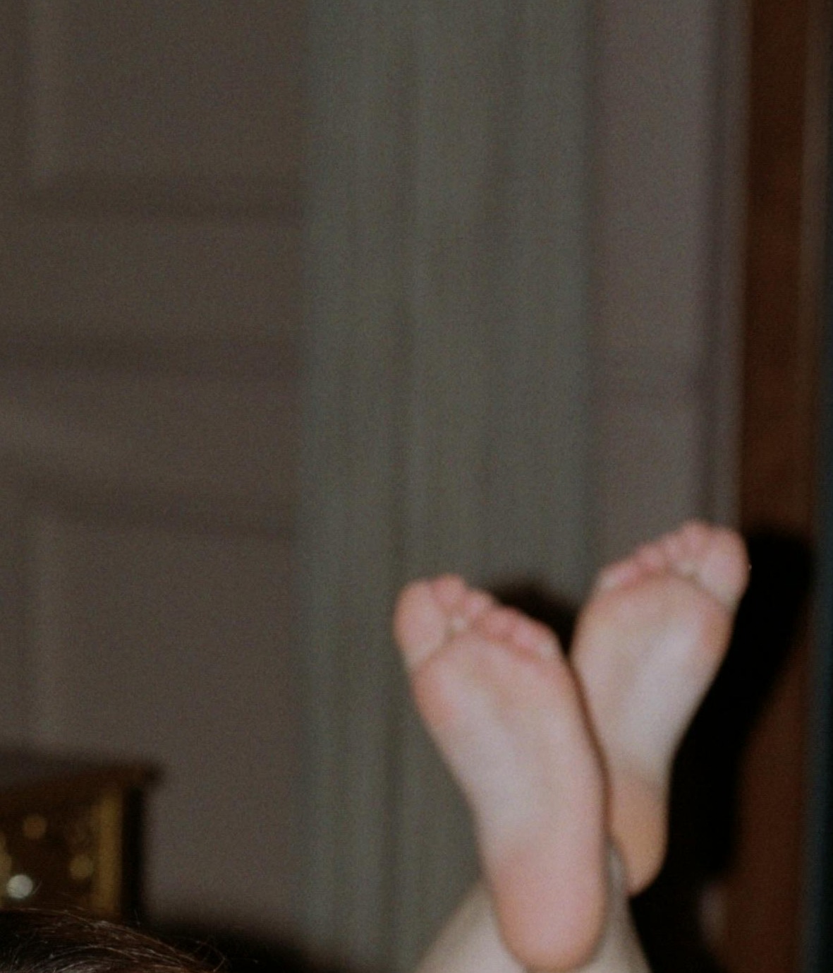 Bare feet crossed lazily in the air, soft bokeh of the room behind — the gesture of total unselfconsciousness, the casual intimacy of someone at ease in private space