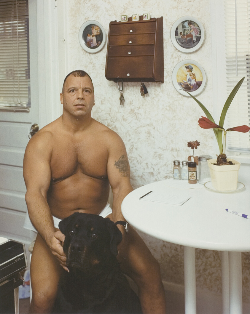 Muscular shirtless man with Rottweiler in a domestic kitchen setting