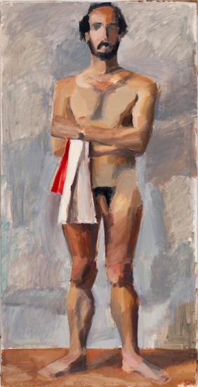 Oil painting of a standing nude male figure with crossed arms holding a white and red towel