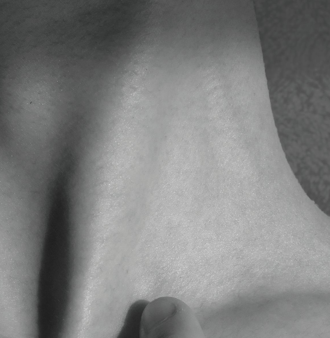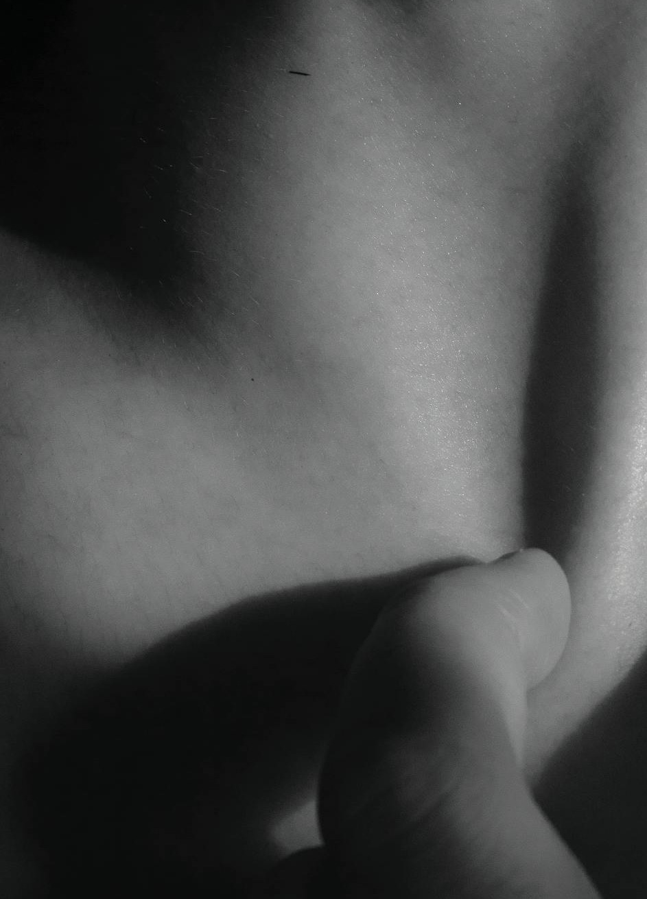 Where fingertips meet the clavicle and upper chest — this junction of hand-on-skin is the locus of the image's entire erotic grammar, skin dimpling slightly under pressure, the intimate geometry of contact rendered in silver tones