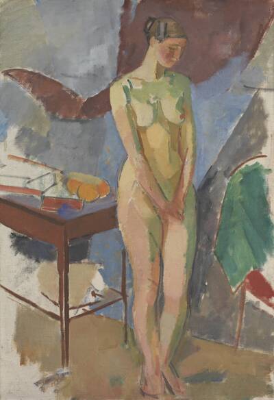 Expressionist oil painting of a standing female nude in a studio interior with fragmented color planes