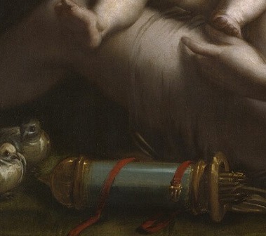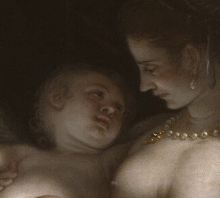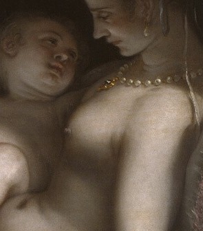 The ermine-trimmed fabric sliding off Venus's right shoulder and upper arm — the fur against luminous skin creates a tactile frisson, the garment neither on nor off, caught in perpetual slippage, the gold embroidery glinting like sweat