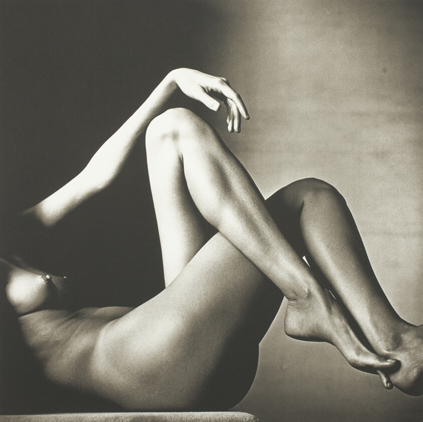 Black and white sculptural nude study of crossed legs and draped hand in dramatic studio light