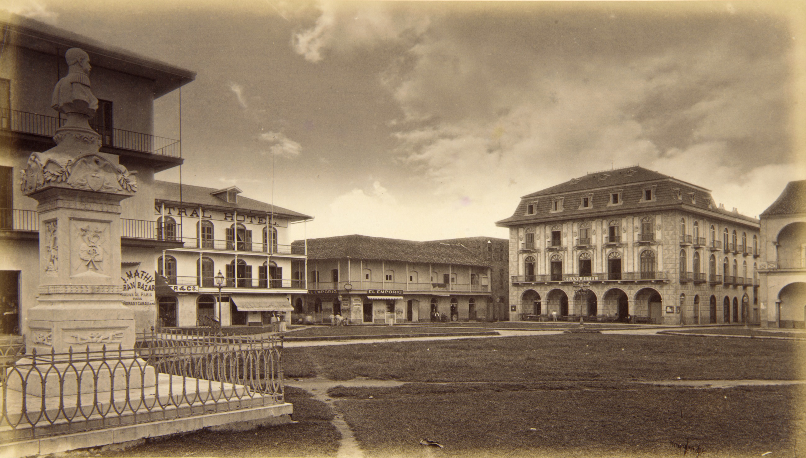 Sepia-toned historical photograph of a Latin American town square with colonial architecture, hotels, and a monument bust