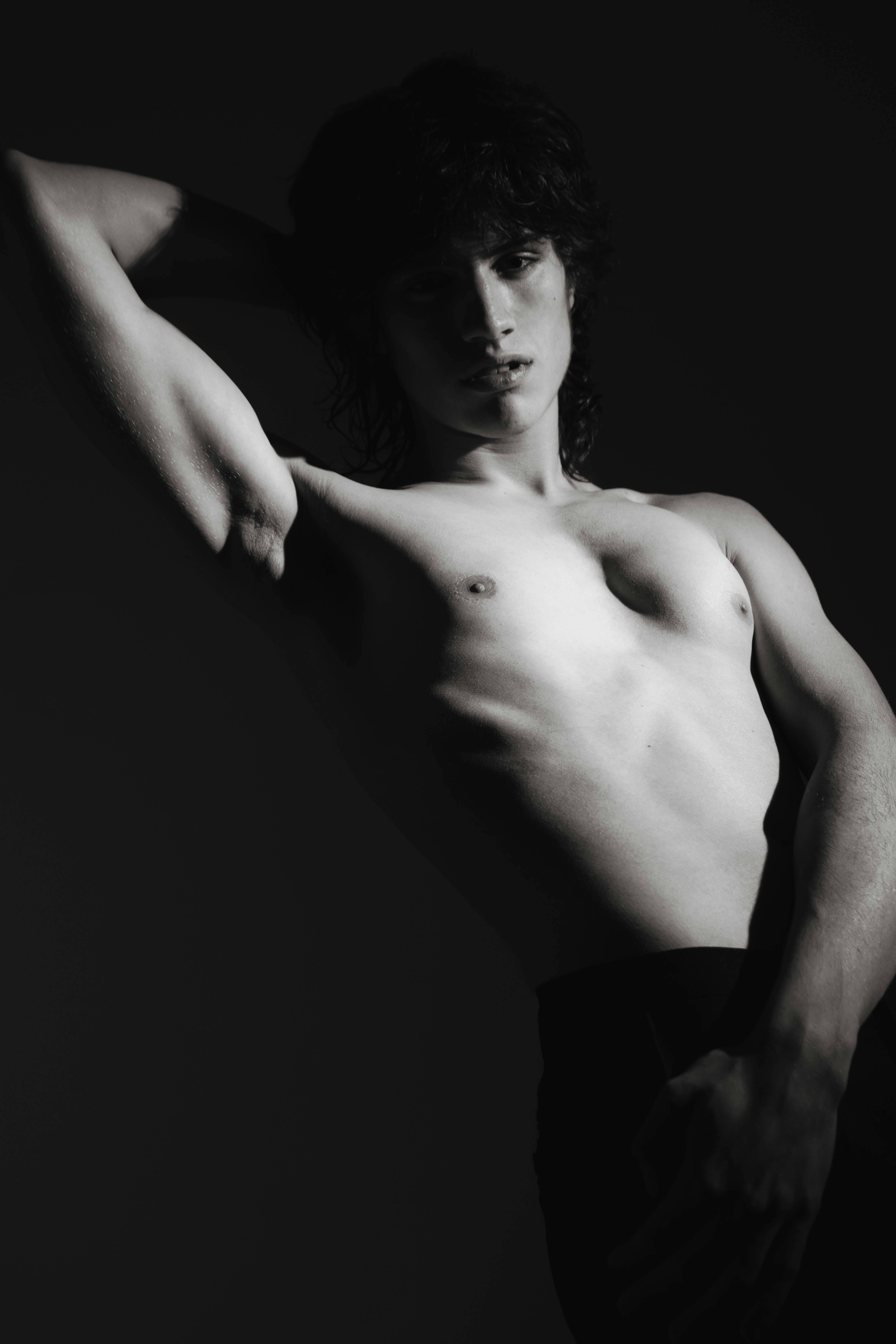 Black-and-white sculptural portrait of a shirtless young man in dramatic chiaroscuro lighting