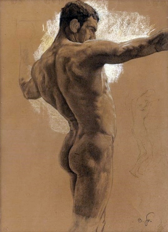 Academic male nude study in charcoal and white chalk on toned paper, posterior view with extended arm