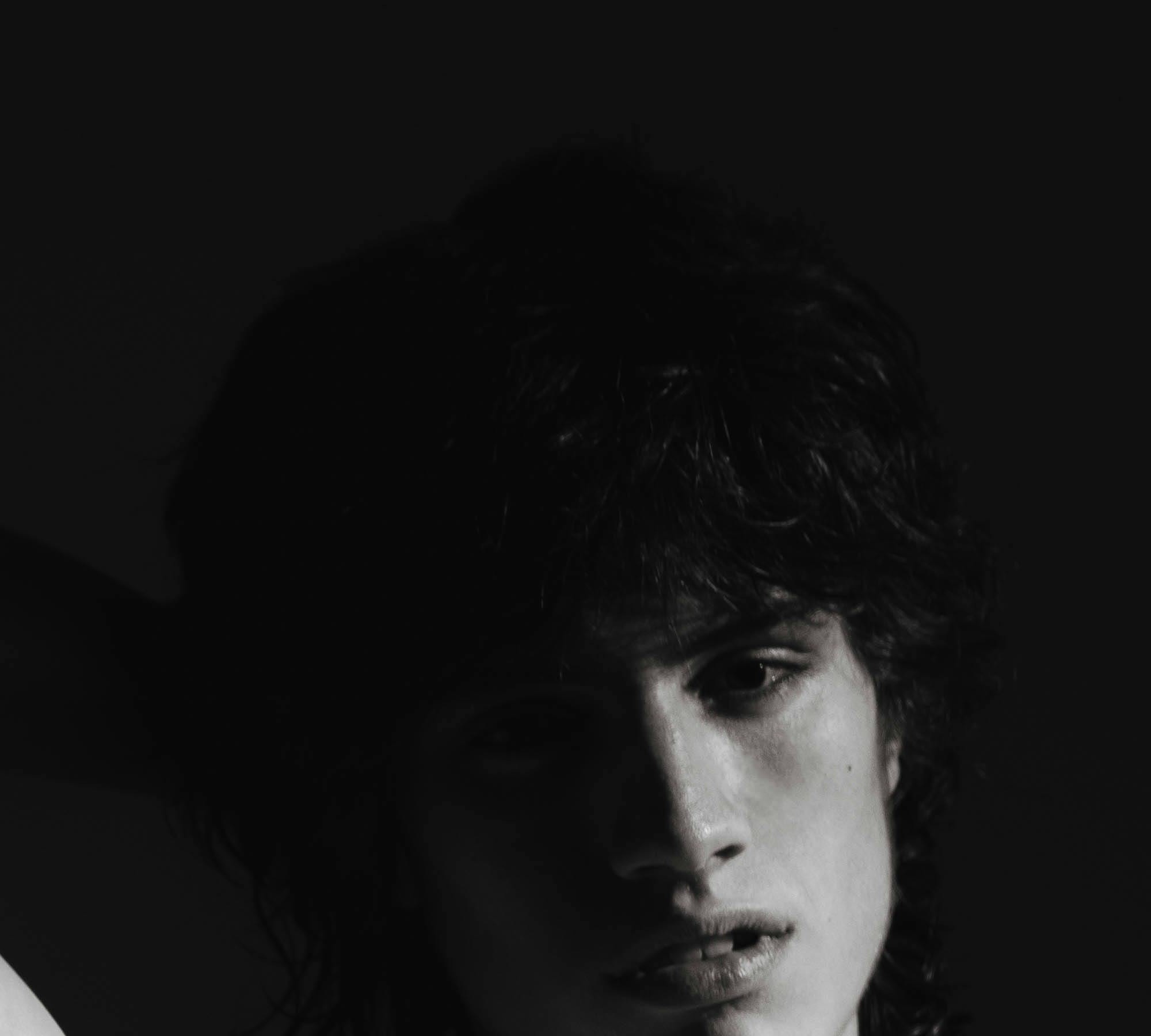 The tousled dark curls falling against the face, half-obscuring one eye, create an immediate intimacy — the Romantic archetype of the unruly, the unconstrained. The hair reads as both vulnerability and wildness.