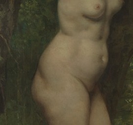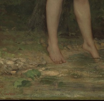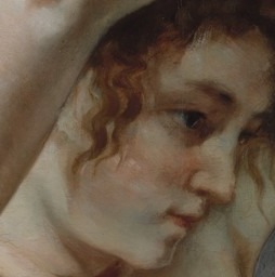 Her downcast, sidelong glance — not meeting ours, looking away and slightly down. This refusal of eye contact intensifies the intimacy; we are seeing someone in a private moment, her reverie unbroken. The slight part of the lips beneath adds quiet breath.