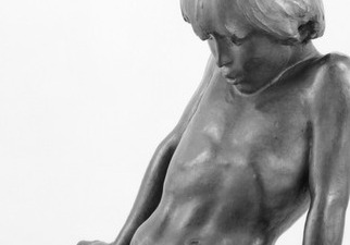 The collarbone and upper chest catch the studio light with a sheen that mimics living skin — the architecture of bone beneath the modeled surface creates a tension between fragility and bronze permanence
