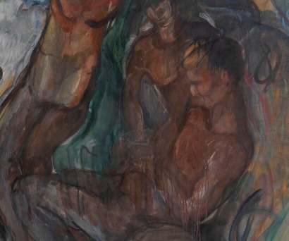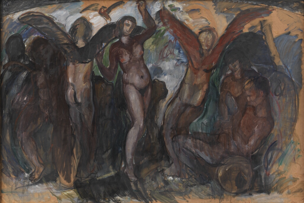 Expressionist painting of nude winged figures in a mythological tableau