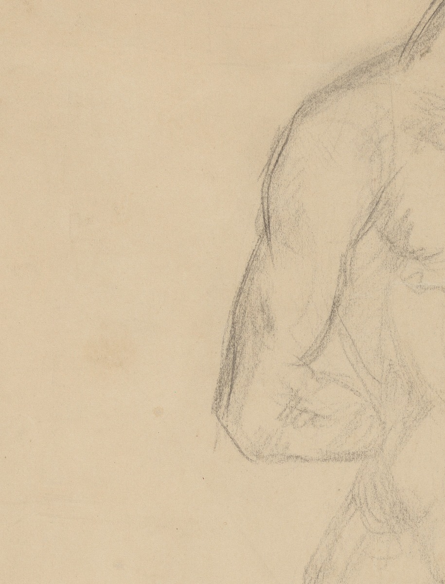 The raised arm creates a sculptural tension in the shoulder and upper arm — the musculature rendered with Lehmbruck's characteristic elongated sensitivity, the gesture of the arm lifted overhead exposing the vulnerability of the torso's side
