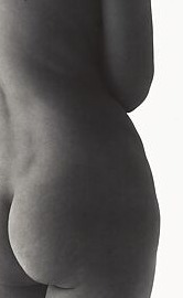 The outer contour line from waist to upper thigh — just the silhouette edge where the figure meets the white void. This boundary between body and nothing is where the image breathes, a single calligraphic stroke of flesh against emptiness.