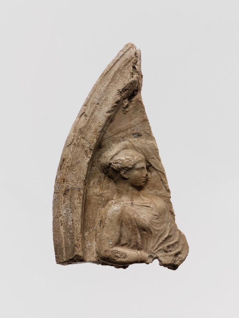 Ancient plaster relief fragment depicting a reclining draped woman within a pointed arch form