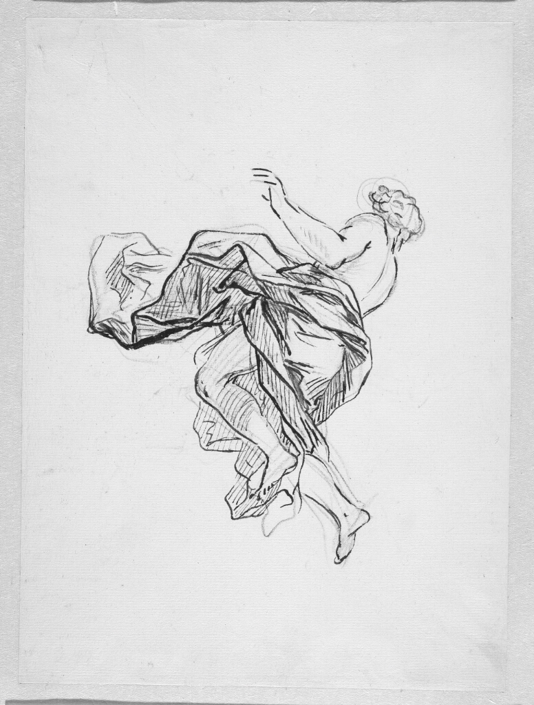 Classical pencil study of a draped figure in dynamic ascending pose with flowing garments