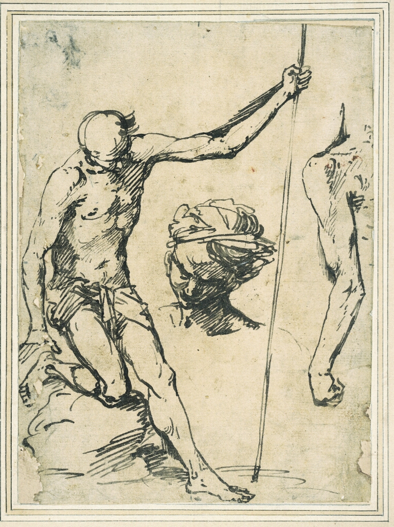 Figure studies: man holding a pole, head of a man with a turban, and a left arm seen from behind