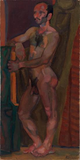 Expressionist oil painting of a standing nude male figure in warm earthy tones against a dark interior