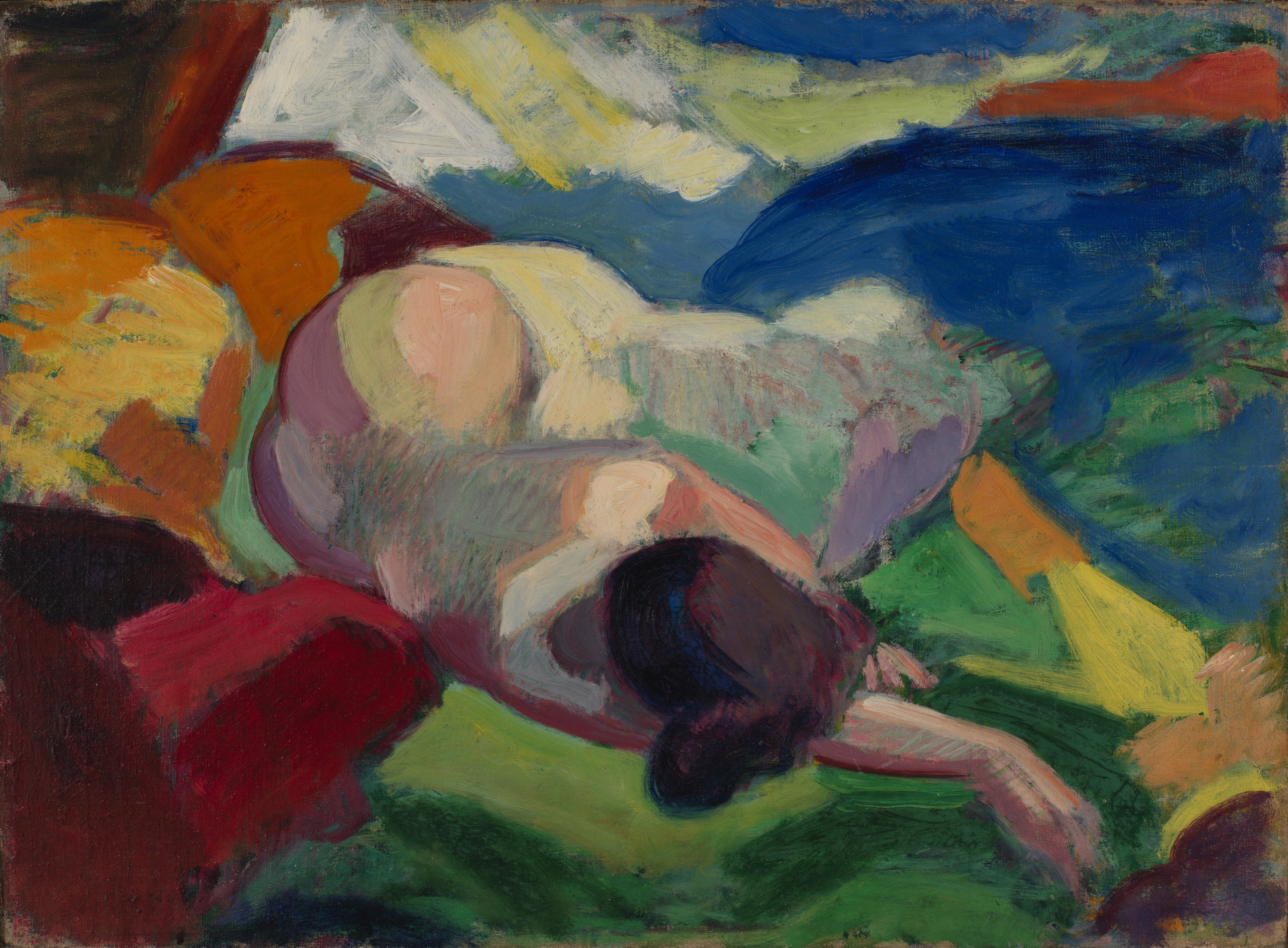 Expressionist watercolor and ink figure study of a reclining woman with bold dark contours