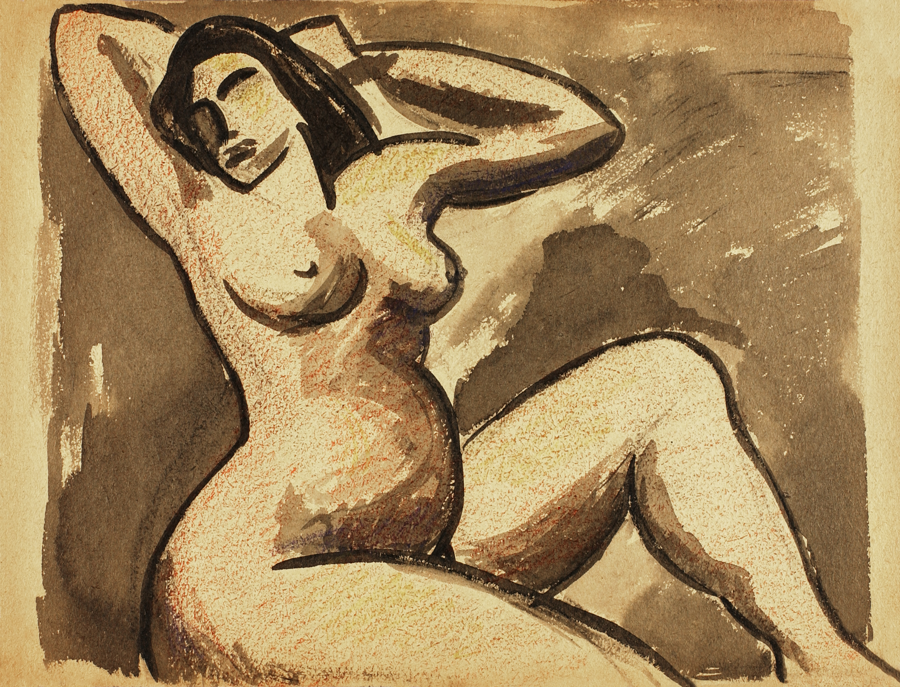 This expressionist figure study captures a reclining woman through bold watercolor washes and decisive ink contours. The artist employs warm sepia tones to model the figure's form while geometric shapes create visual tension against the organic curves of the body. Dark linear elements define the composition's structure, emphasizing the interplay between light and shadow across the figure's skin. This work demonstrates how expressionist techniques can transform traditional figure drawing into an exploration of emotional resonance and formal experimentation.