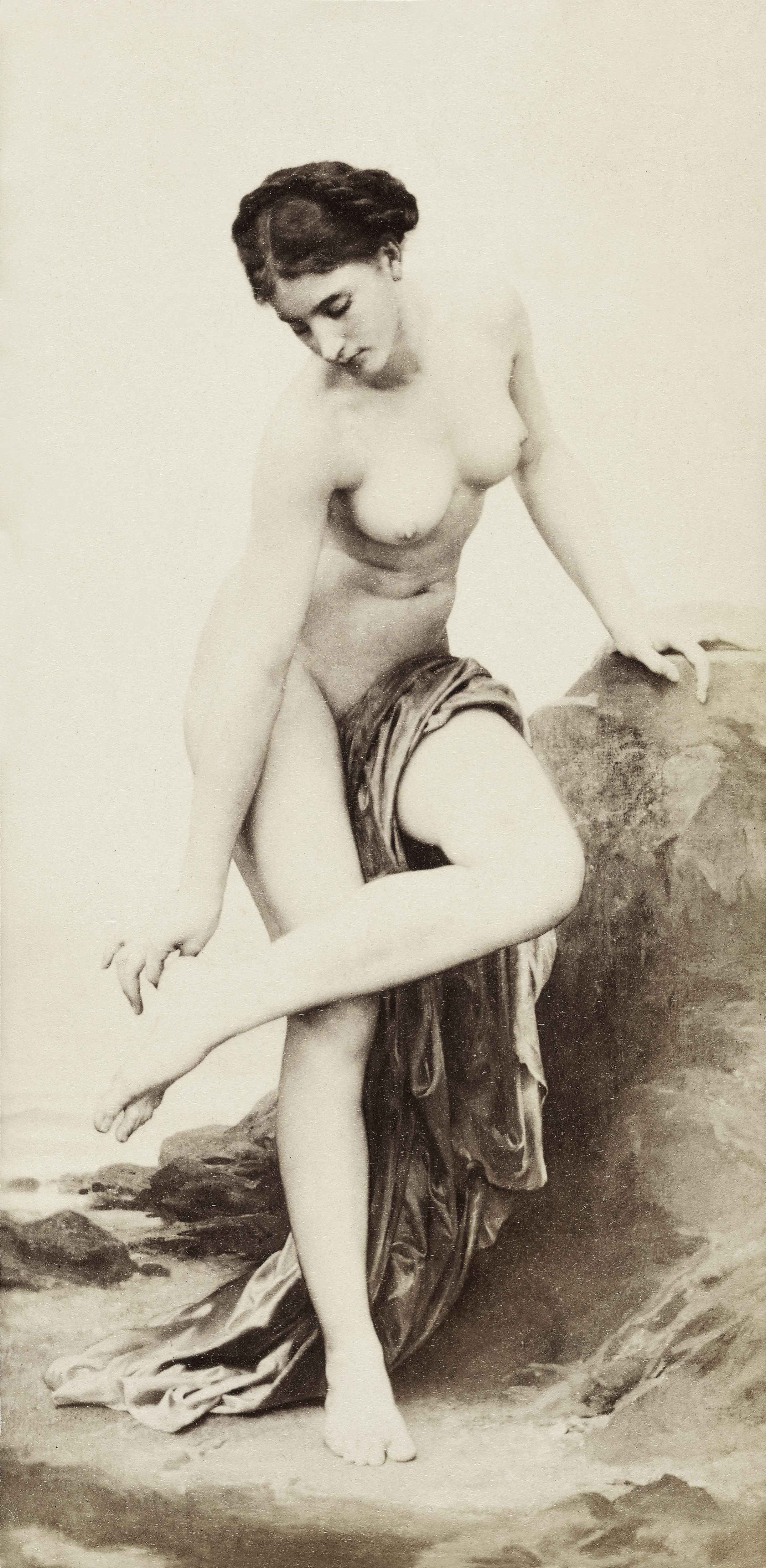 Sepia-toned classical nude figure seated on rocks with draped fabric