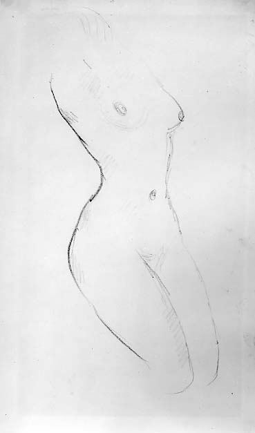 Minimal pencil contour drawing of a female torso in three-quarter view