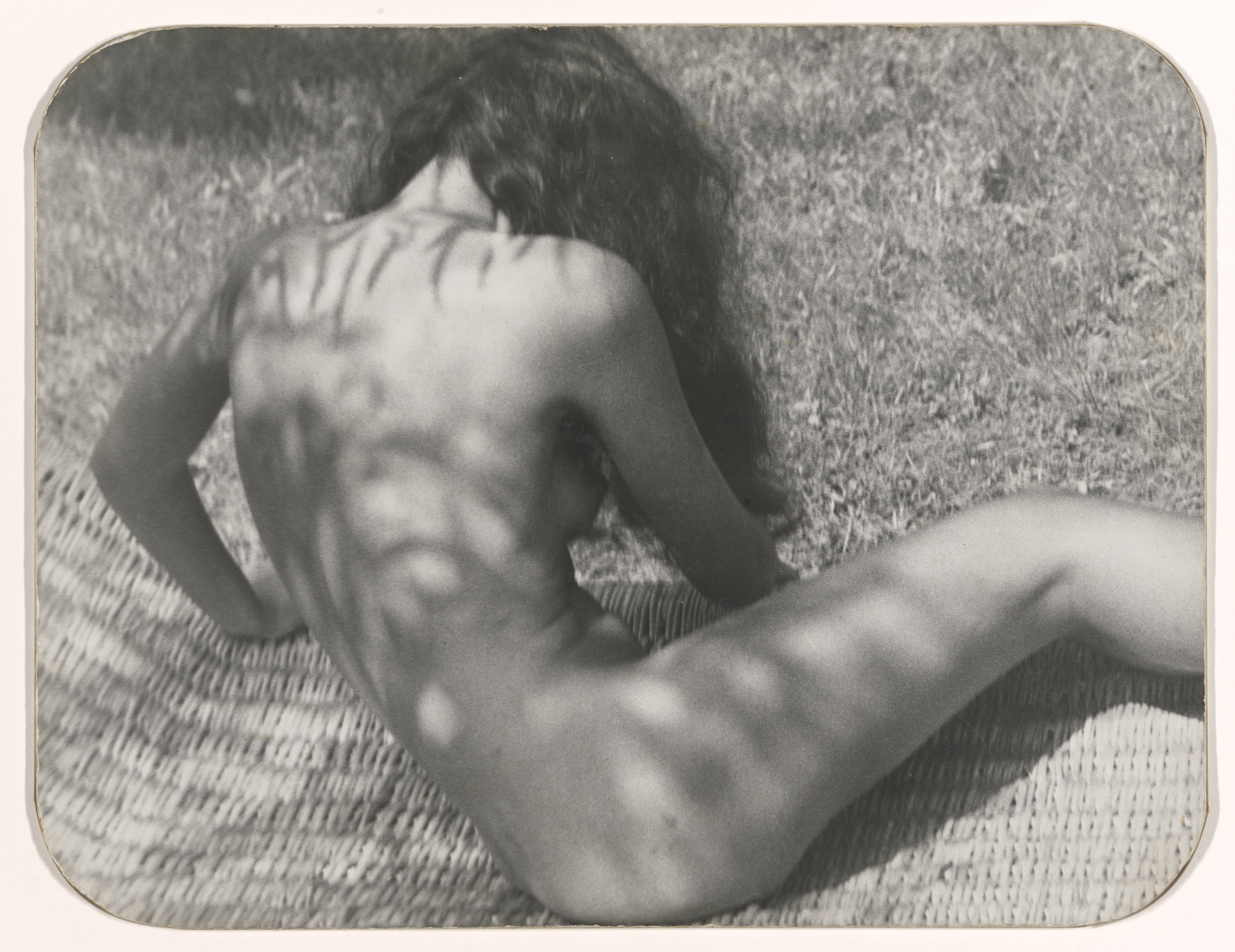 Black and white nude reclining on woven mat, dappled light on back