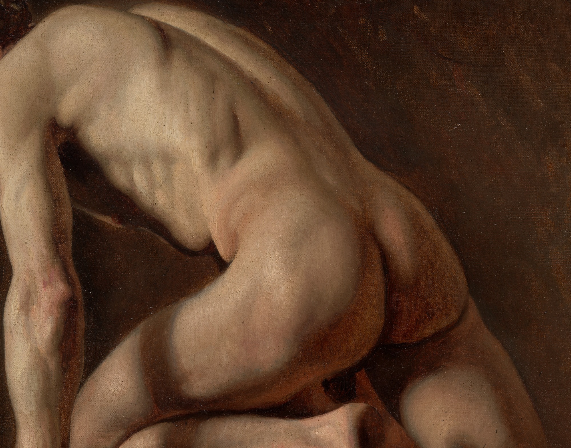 The long diagonal of the back — from shoulder blade to the shadow where the hip begins — is the painting's central aria. Every vertebra implied beneath luminous skin, the scapula's architecture, the latissimus catching warm Caravaggesque light against the deep umber ground. This is anatomy as landscape.
