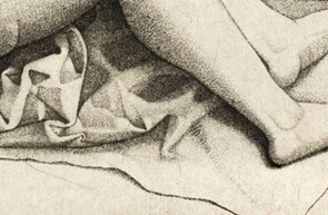 The crossed ankles and bare feet resting on rumpled drapery — an intimate, unguarded detail. The feet's casual crossing implies a body at ease in its own nakedness, resolving the image's tension into quiet stillness.