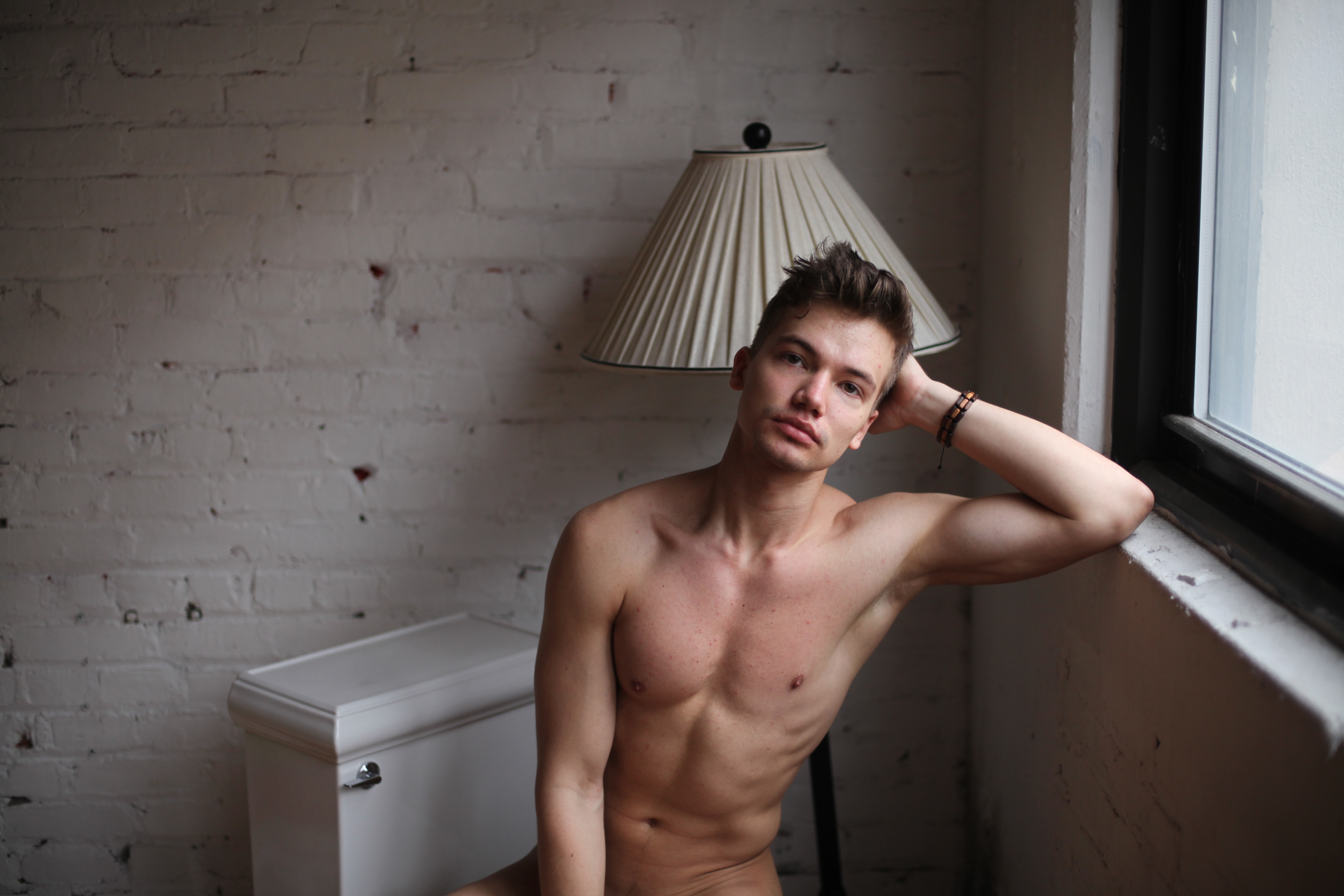Shirtless young man leaning against window in a white brick bathroom, soft natural light