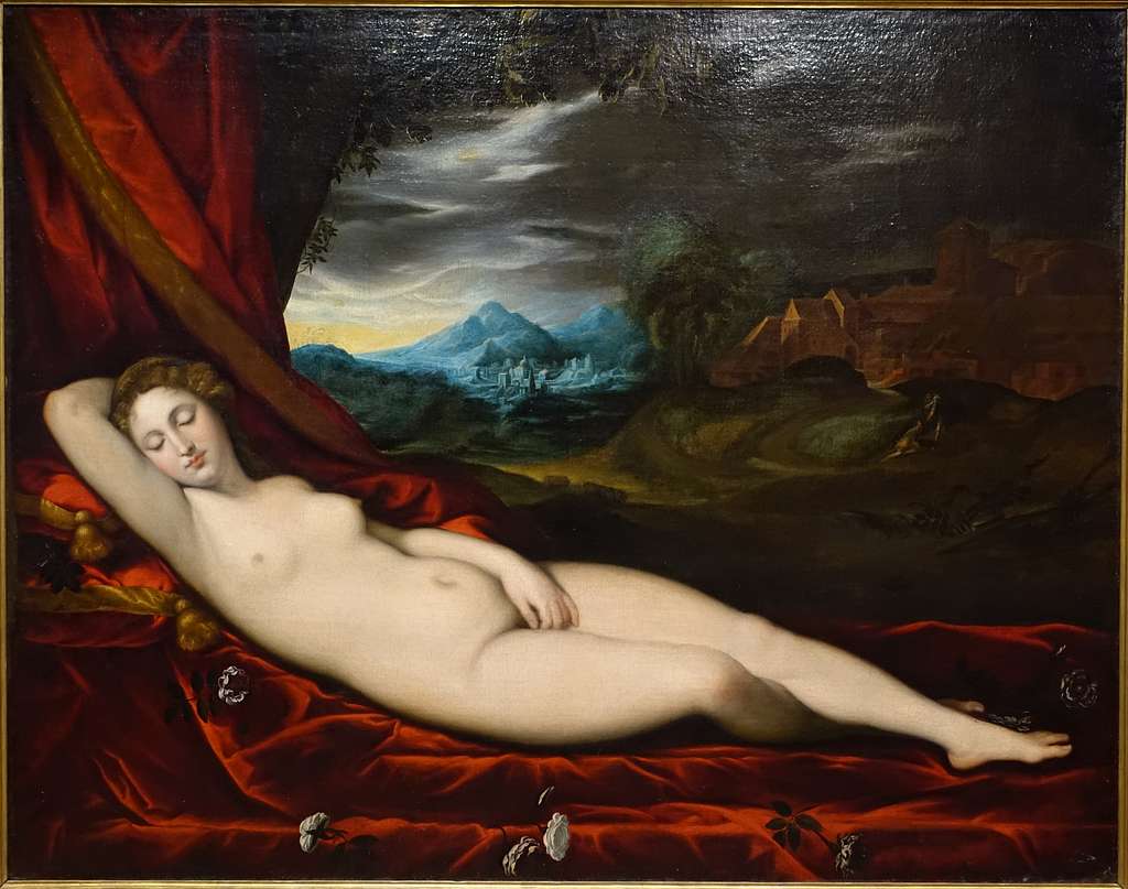 Renaissance oil painting of a reclining sleeping nude Venus on red drapery with dramatic landscape