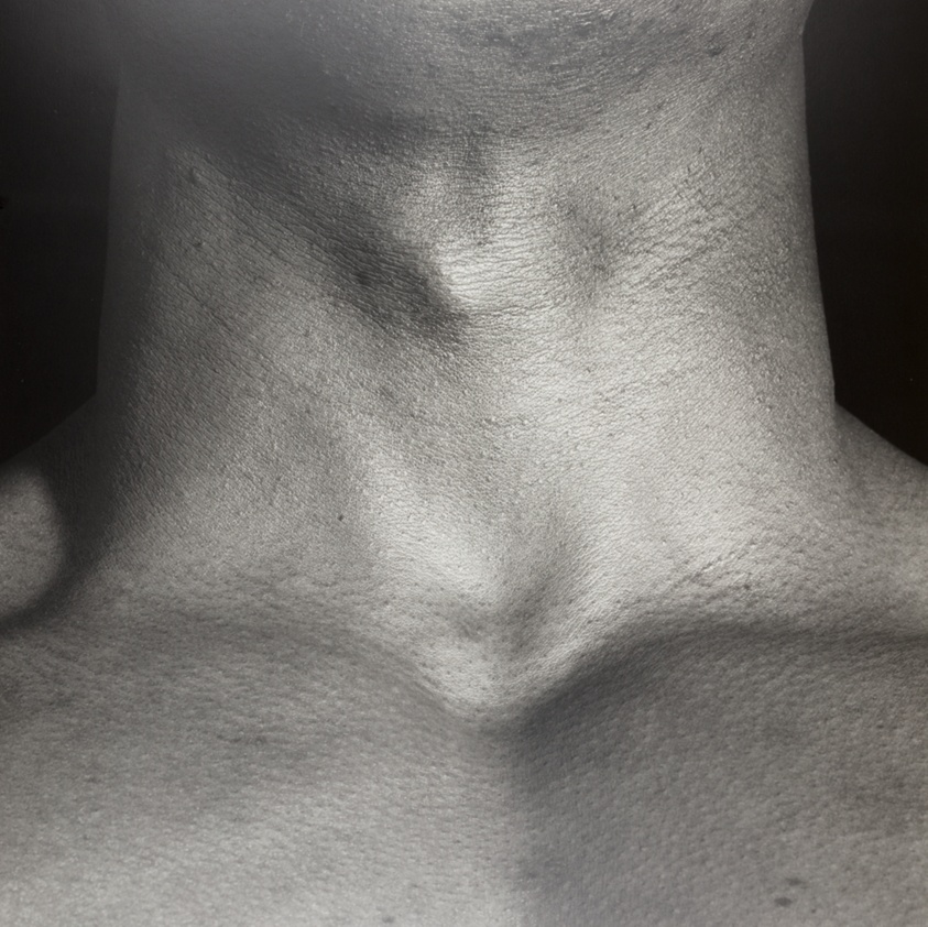 Black and white extreme close-up of neck and collarbone with sculptural lighting