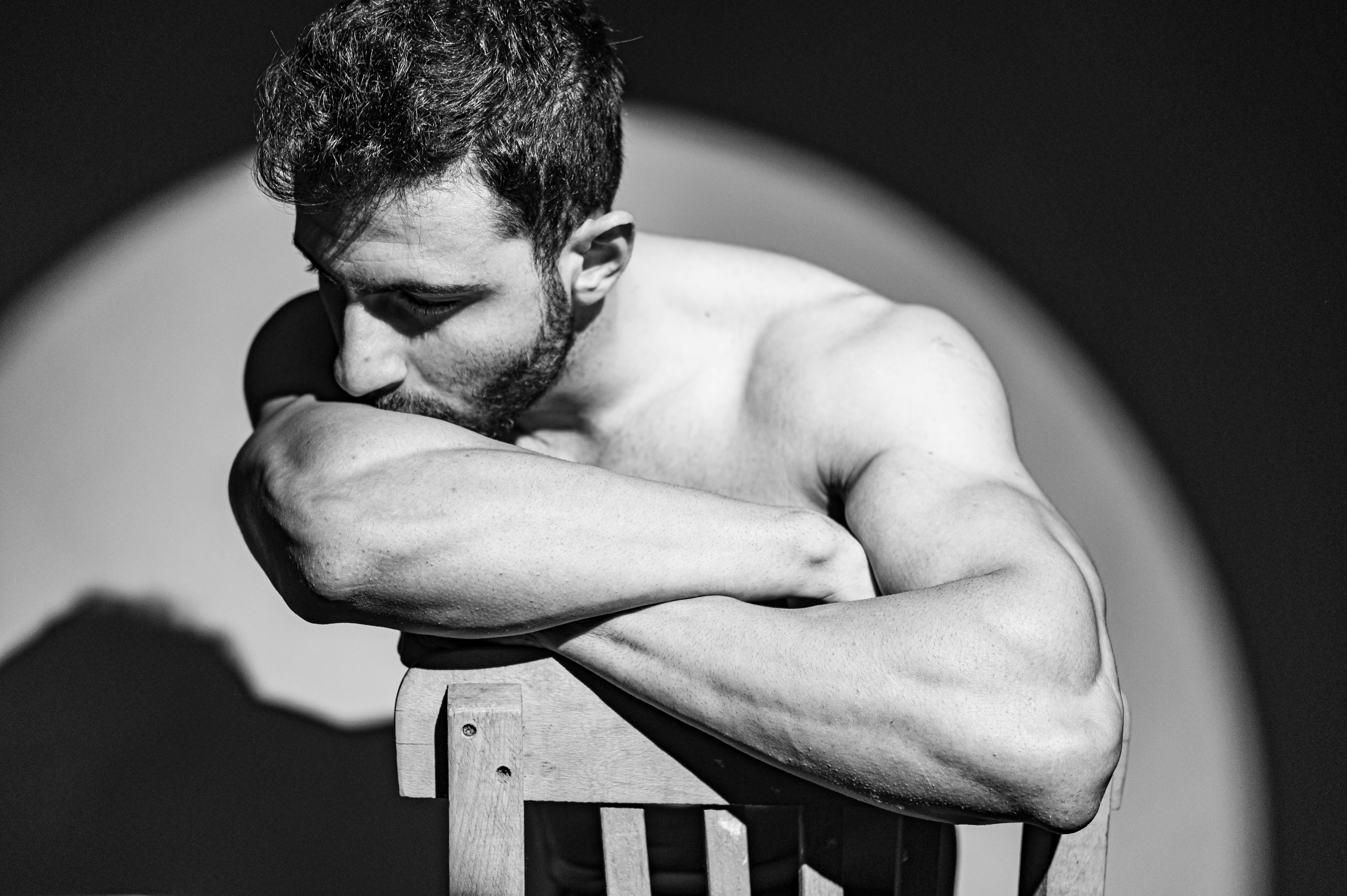Shirtless man resting arms on chair back in dramatic black-and-white chiaroscuro