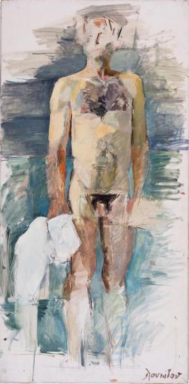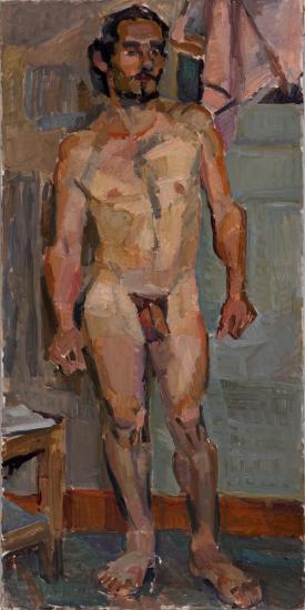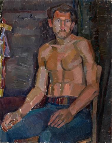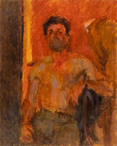 Expressionist oil painting of a seated man in warm orange and ochre tones