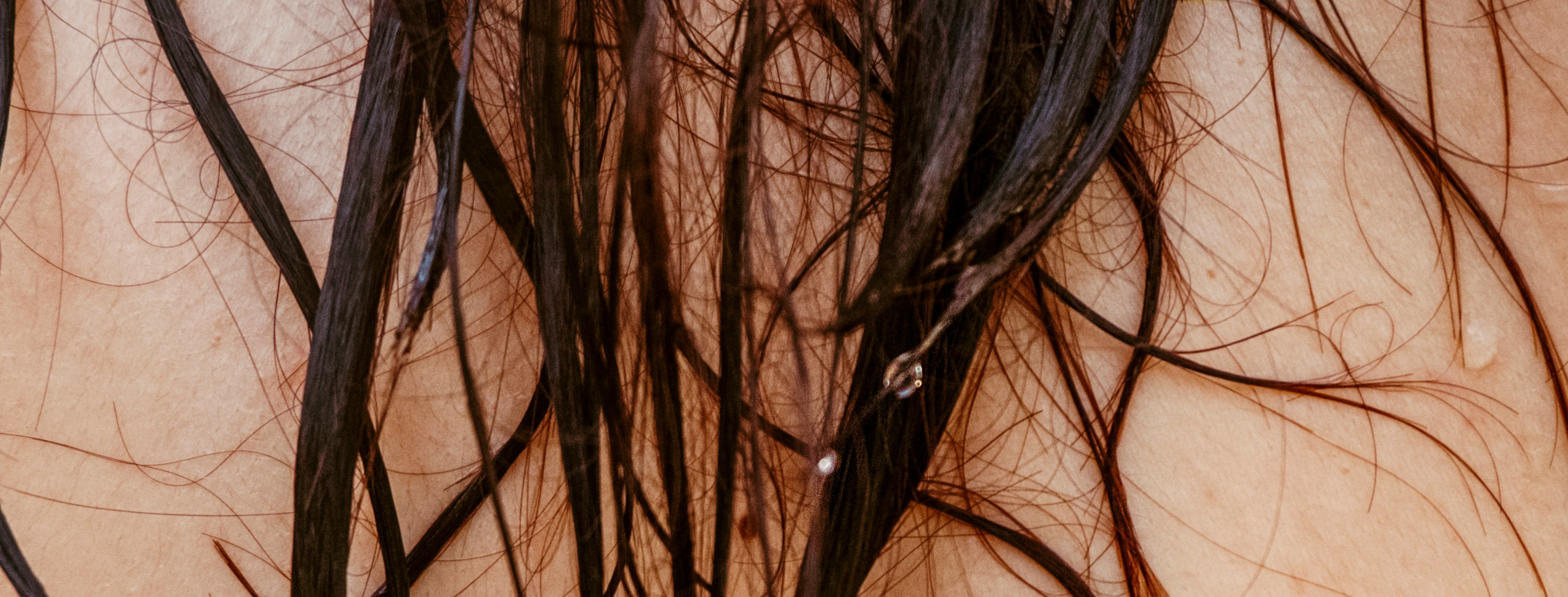 The wet dark strands cascading downward create a calligraphic tension against bare skin — each tendril a line of touch, the water droplets caught mid-fall like suspended breath