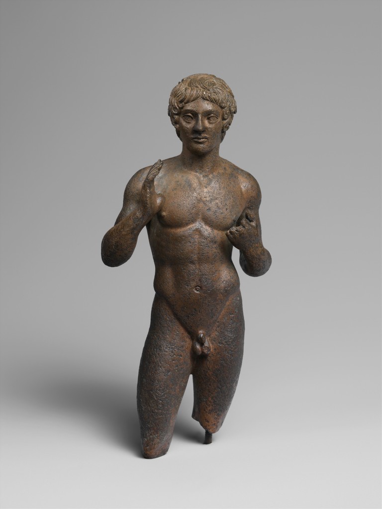 Ancient bronze statuette of a nude male youth in classical Greek or Roman style