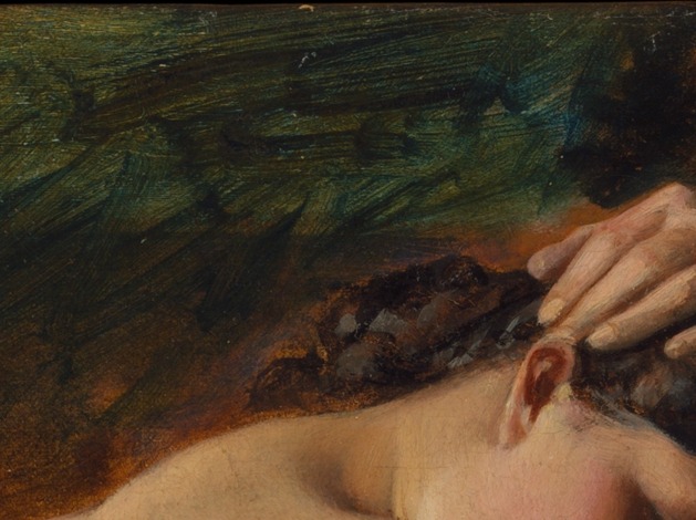 The hand pressed into dark braided hair, fingers half-buried — an intimate, self-touching gesture that suggests private reverie, the weight of the head surrendered into the palm