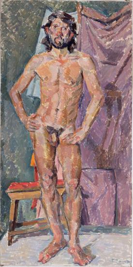 Painterly oil study of a standing nude bearded man with hands on hips against a purple draped background
