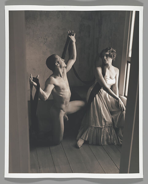 Muscular male nude seen from behind, reaching toward foliage in a pastoral landscape, black-and-white silver print