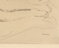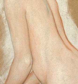 The feet drawn with the lightest, most tentative lines — barely there, almost dissolving into the sheet. The casual crossing of ankles speaks to complete abandon, the unguarded extremity that resolves the figure's tension