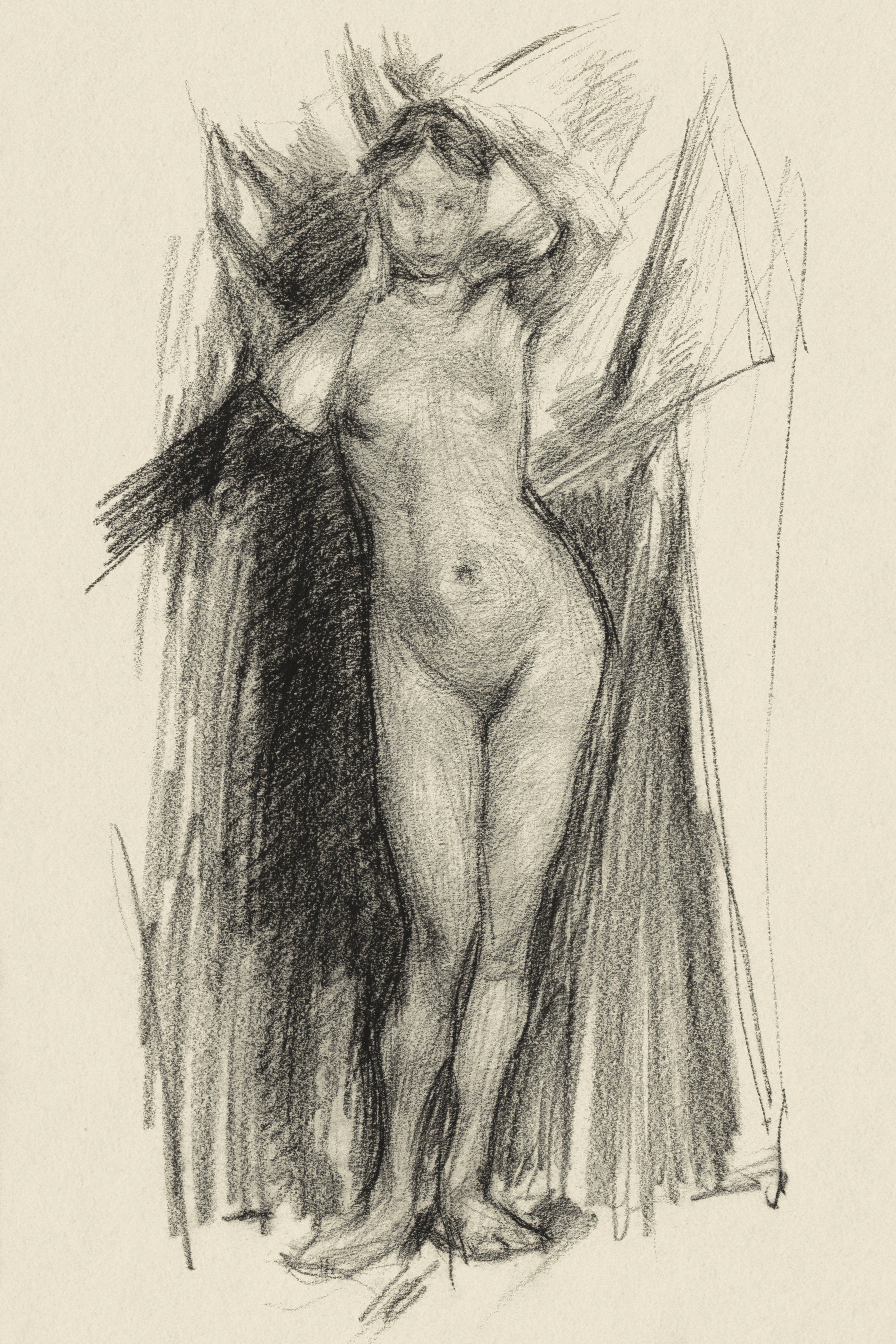 Charcoal life drawing of a standing female nude with arms raised, rendered in gestural academic style