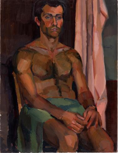 Painterly oil portrait of a seated shirtless man with mustache, bold brushwork and warm tones