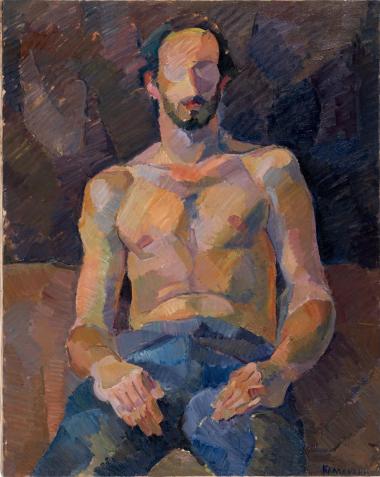 Painterly oil portrait of a shirtless seated man in jeans, rendered in bold faceted brushstrokes with warm and cool tones