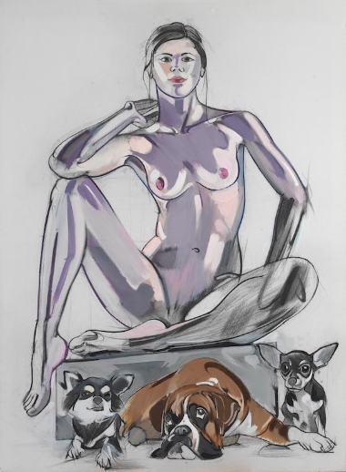 Expressive painted nude woman seated above three dogs in bold gestural style