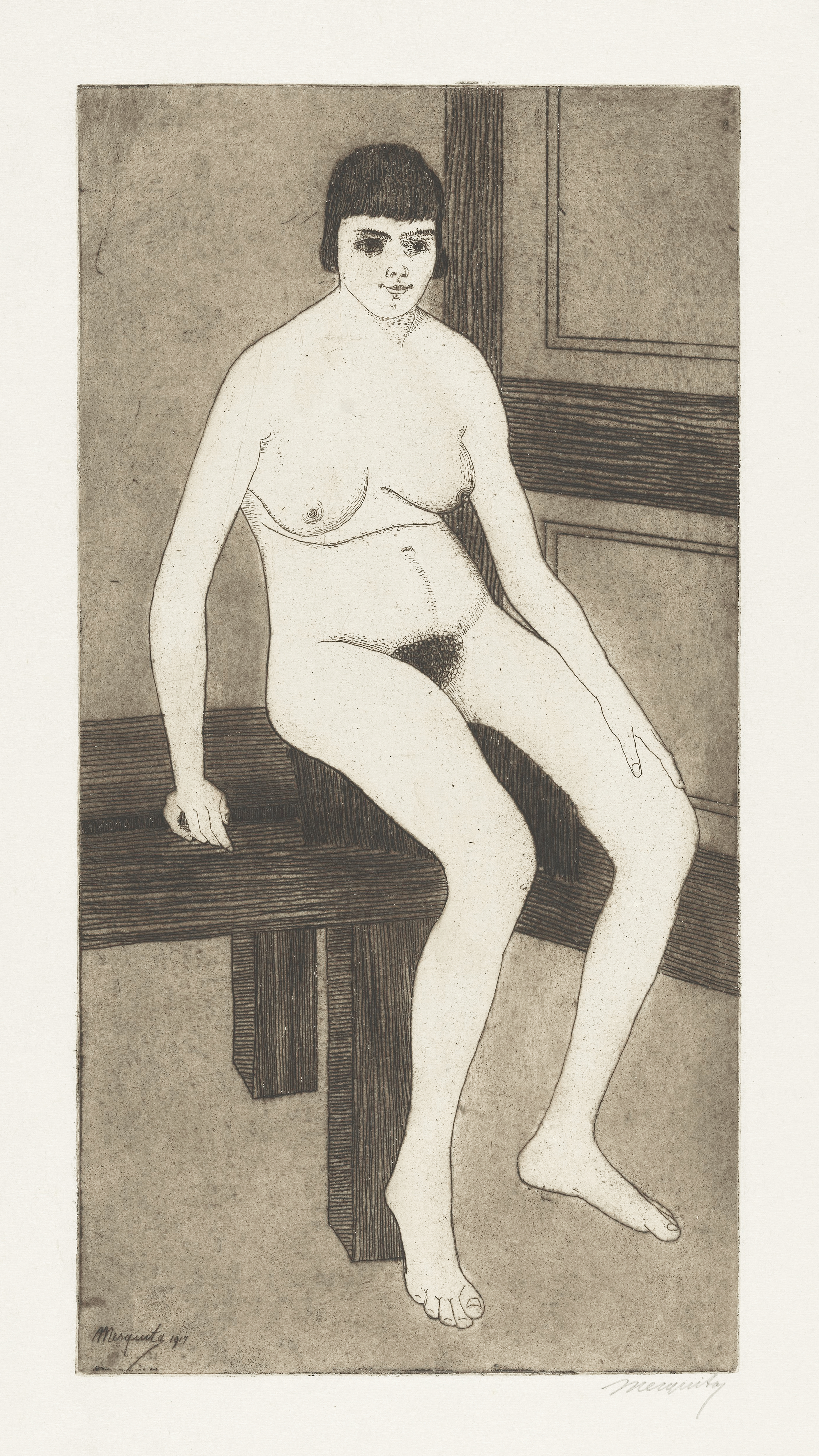 Etching of a seated nude woman on a wooden bench in an interior setting