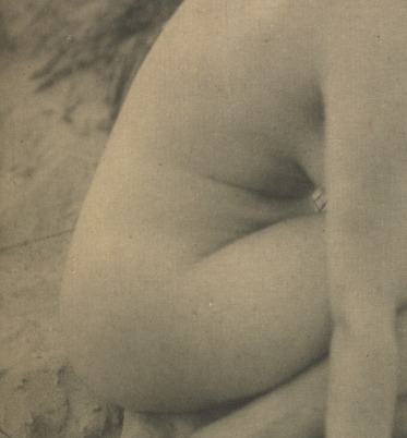 The folded geometry of the crouching figure — shin pressed to thigh, arm wrapping inward — creates an architecture of self-containment. The Pictorialist soft focus renders flesh as landscape, the body curled like a shell on sand