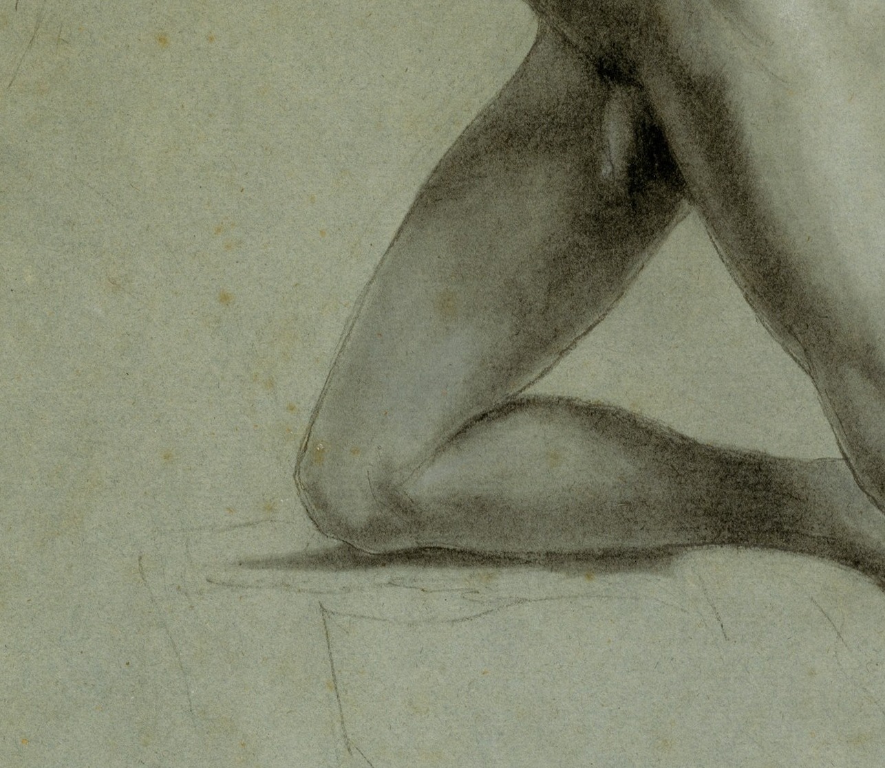 The deep lunge creates a triangle of negative space between the thighs — geometry that implies power and openness simultaneously. The inner thigh's shadow and the muscular tension of the stance carry a quiet, structural eroticism.