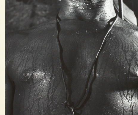 The torso where sweat traces the musculature like cartography, the whistle pendant hanging at the sternum's base — an icon of labor that transforms the body into both instrument and terrain, the cord a thread of authority against bare skin